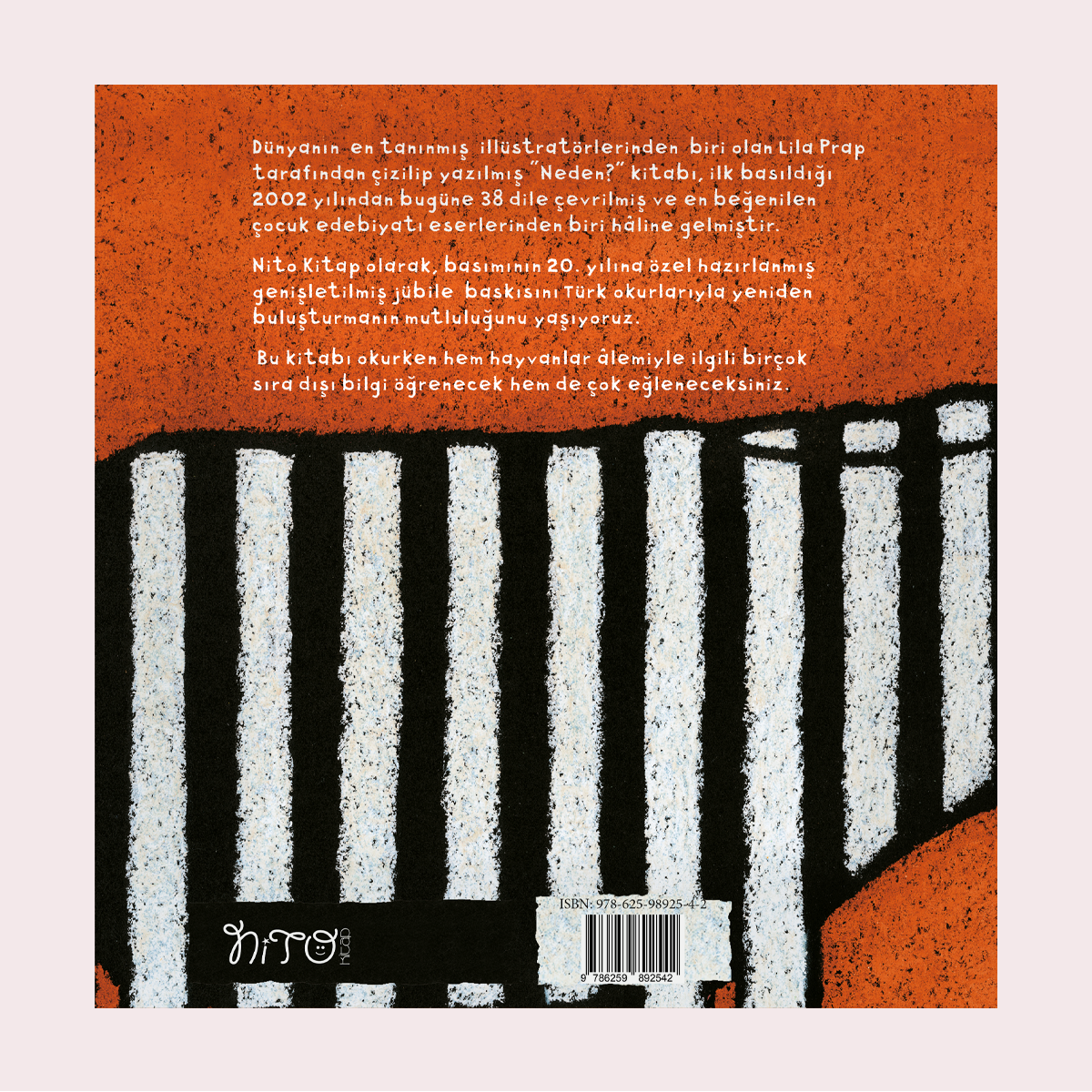 Dünyanın en tanınmış illüstratörlerinden biri olan Lila Prap tarafından çizilip yazılmış “Neden?” kitabı, ilk basıldığı 2002 yılından bugüne 38 dile çevrilmiş ve en beğenilen çocuk edebiyatı eserlerinden biri hâline gelmiştir. Nito Kitap olarak, basımının 20. yılına özel hazırlanmış genişletilmiş jübile baskısını Türk okurlarıyla yeniden buluşturmanın mutluluğunu yaşıyoruz. Bu kitabı okurken hem hayvanlar âlemiyle ilgili birçok sıra dışı bilgi öğrenecek hem de çok eğleneceksiniz.