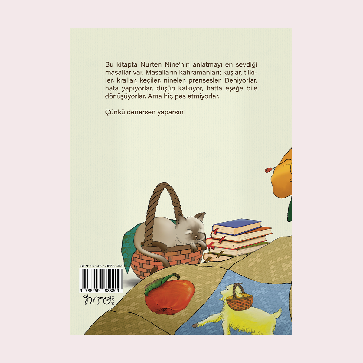 Bu kitapta Nurten Nine’nin anlatmayı en sevdiği masallar var. Masalların kahramanları; kuşlar, tilkiler, krallar, keçiler, nineler, prensesler. Deniyorlar, hata yapıyorlar, düşüp kalkıyor, hatta eşeğe bile dönüşüyorlar. Ama hiç pes etmiyorlar. Çünkü denersen yaparsın!