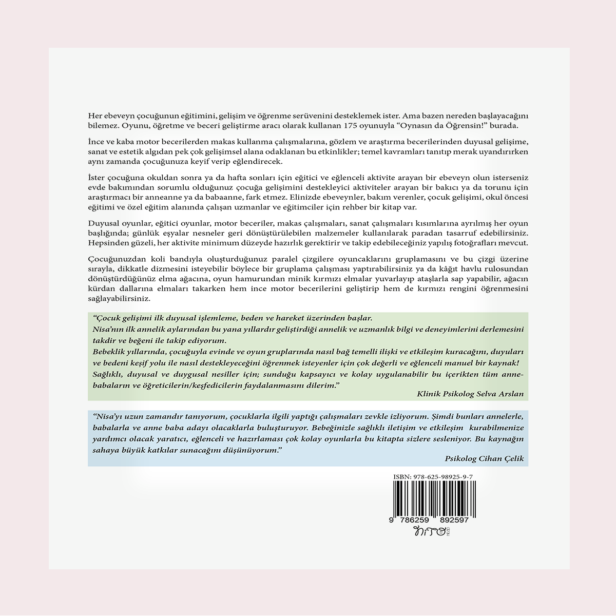 ÖN SATIŞ 26 Mart Kargo Teslim OYNASIN DA ÖĞRENSİN 2-4 Yaş ( 24-48 Ay) Oyun Rehberi Her ebeveynin, çocuğunun eğitimini, gelişimini ve öğrenme serüvenini desteklemesini ister. Ama bazen nerede yapılacağını bilemez. Oyun, öğretme ve beceri geliştirme aracı olarak kullanan “Oynasın da Öğrensin!” İşte tam da bunun için yazıldı. Duyusal, eğlenceli oyunlar, motor, makas ve sanat çalışmaları şeklinde, yaş aralıklarına göre bölümlere ayrılmış 175 farklı oyun ile hem çocuklar keyifli vakit geçirecek hem de pek çok gelişimsel alanda desteklenmiş olacak. Bu oyunların günlük günlük aksesuarları ya da geri dönüştürülebilen yöntemleri kullanmanız mümkün. Hepsinden güzel, onun aktivitelerinin minimum seviyede hazırlıkları olması gerekiyor. Oyunu sunulan ve eğlenceli aktiviteler arayan bir ebeveyn ister evde bakımından sorumlu tutulabilir, ister geliştirme faaliyeti arayan bir bakıcı ya da araştırmacı bir büyükanne ya da büyükbaba, fark etmez. Hem ebeveynlerin hem bakım verenlerin hem de çocuk gelişimleri, okul öncesi eğitim ve özel eğitim alanında çalışan, kullanılan ve eğitimciler için rehber bir kitap var elinizde. Tüm çocuklara ve insanlarınçilerine keyifle sunduk Kitap Adı: Oynasın da Büyüsün